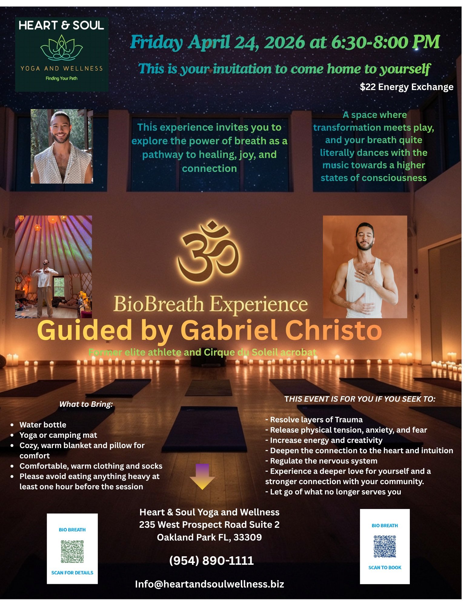 Guided by Gabriel Christo — former elite athlete and Cirque du Soleil acrobat — this experience invites you to explore the power of breath as a pathway to healing, joy, and connection. After years of personal transformation through breath, Gabriel has crafted a practice that makes breathwork feel fun, inspiring, and accessible. A space where transformation meets play, and your breath quite literally dances with the music towards high states of consciousness.